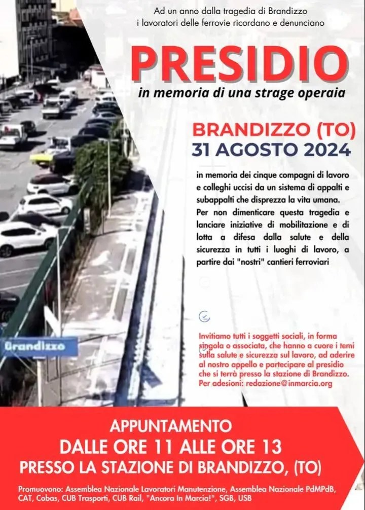 Aderiamo all’appello delle Assemblee nazionali dei ferrovieri e dei sindacati di base e partecipiamo al presìdio il 31 agosto alle ore 11.00 di fronte alla stazione di Brandizzo (To) per una scelta di classe giusta, sentita e praticabile.