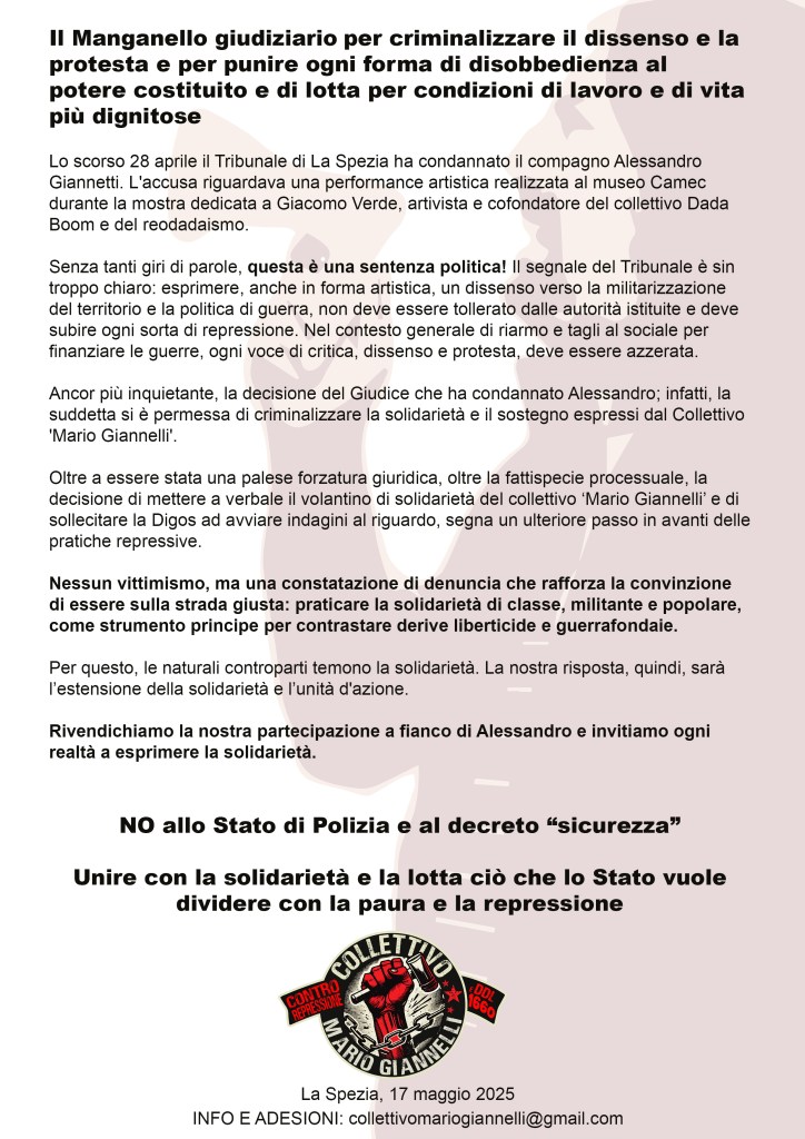 Collettivo Mario Giannelli contro la repressione e la legge 80/2025 (ex dls 1660)