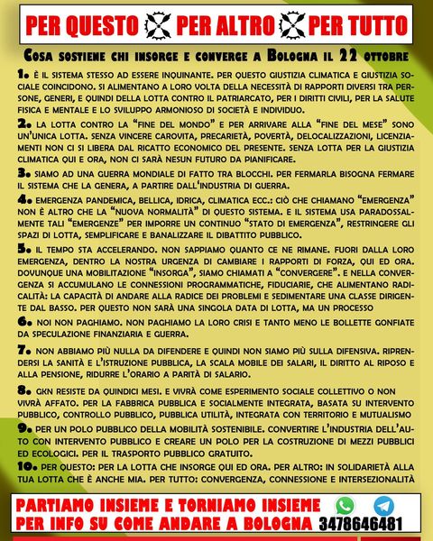 Invitiamo caldamente a partecipare a questo nostro impegno tutte e tutti coloro che riconoscono i limiti dell’attuale stato della discussione e intendono contribuire e concorrere all’elaborazione puntuale e alla messa a punto di una prospettiva politica di classe più efficace, in grado di offrire alle mobilitazioni d’autunno una indicazione di lotta anzitutto contro “il nemico in casa nostra”: il capitalismo italiano – nella direzione del rovesciamento dello stato di cose presenti. Ancora invitiamo alla partecipazione tutte e tutti coloro che avvertono, nel vuoto costituito dall’assenza di una compattezza programmatica delle forze di classe, una necessità di riflessione e di arricchimento che sfoci in un riferimento teorico-politico per chi brancola negli spazi morti di questo sistema.
