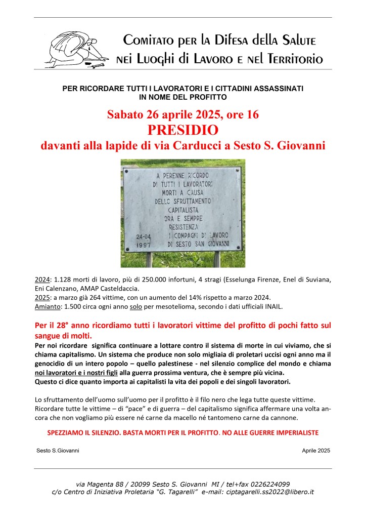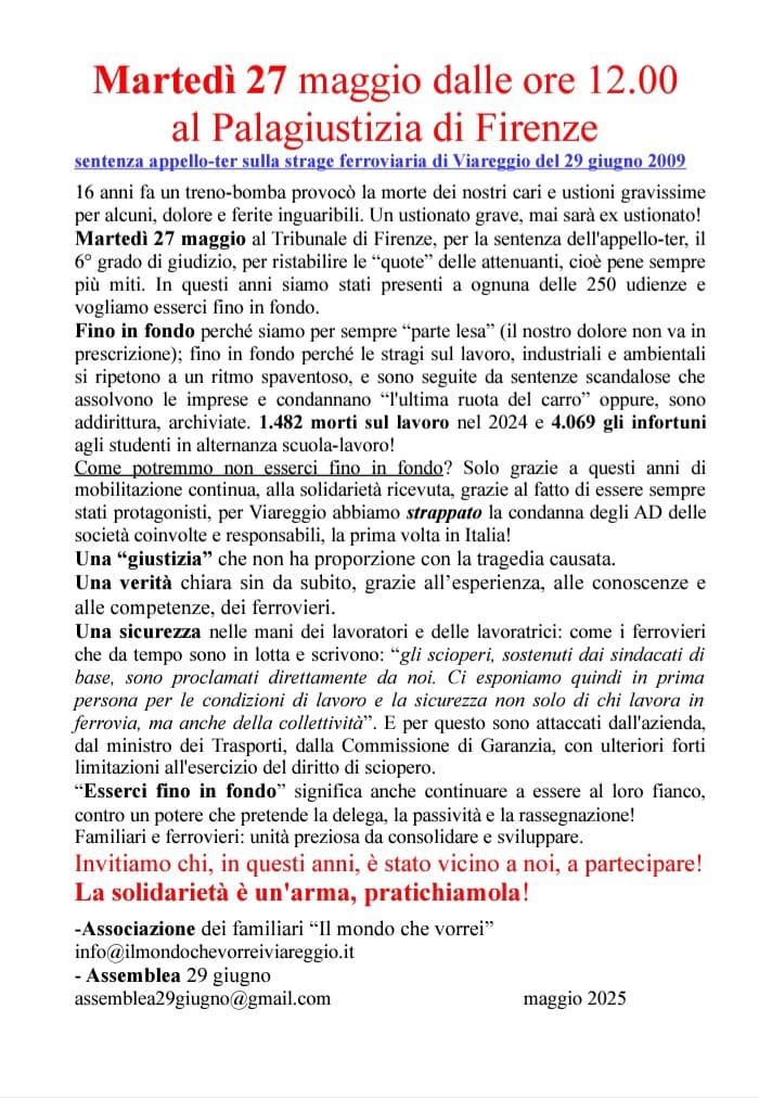 Saremo lì per essere accanto, con affetto, alle mamme e ai familiari; ma anche perché questa strage è stata per noi un grande insegnamento: ha mostrato che condannare gli operai a lavorare in certe condizioni (ormai generalizzate) porta inevitabilmente, prima o poi, all’incidente, alla morte, alla strage. Quello che non si sa è quando esattamente accadrà e a chi toccherà.